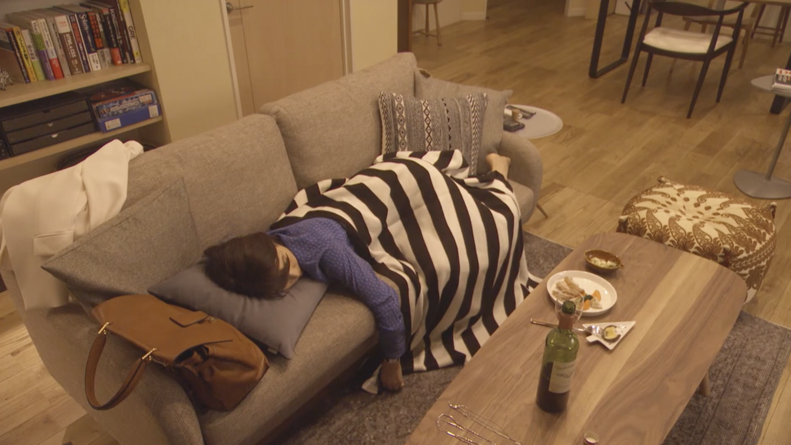 COMMENT:二人で相談してハグの日を火曜日に設定したにも関わらず、二度目のハグは緊急事態を乗り切るために金曜日にすることになったくだり。新婚の雰囲気を醸し出そうと二人でいろいろ画策しても、ハプニングにハプニングが重なってなかなかうまくいきません。アタマで考えてやる行動というのはだいたいうまくいかないものなんですが。うまくいかない中で、少しずつ二人の距離が近づいていくものの、その速度があまりに遅いので、ドラマを観ているわたしたちがムズムズしながら、キュンキュンしてしまうということから、「ムズキュン」という言葉が生まれたのでしたね。