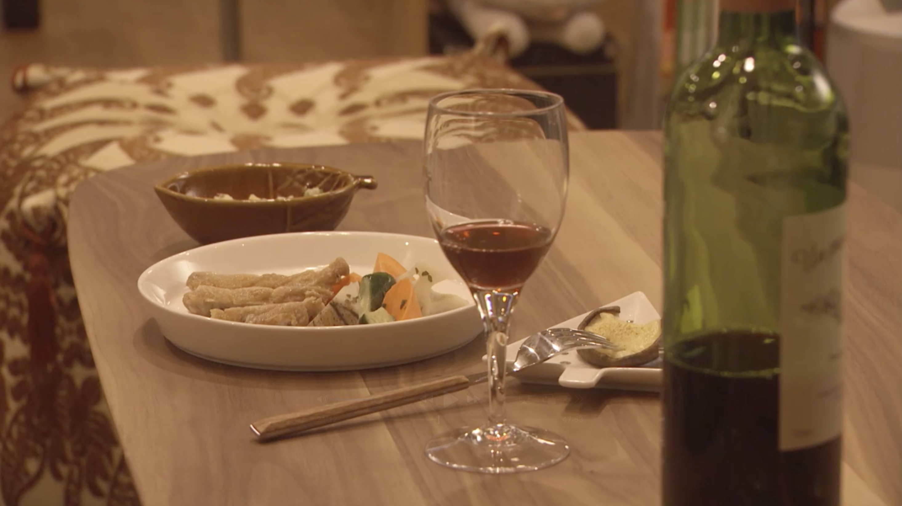 〔テーブルの上に飲みかけのワインとつまみ〕