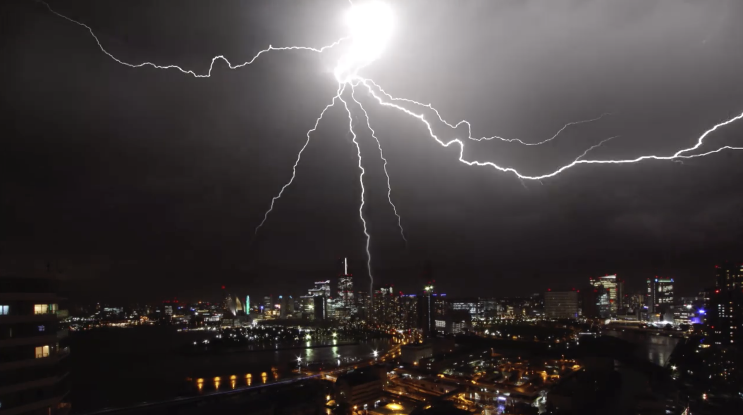 〔夜空に突然ピシッと閃光が走り、ガラガラどっしゃーんと落雷。激しい雨が降り出す〕