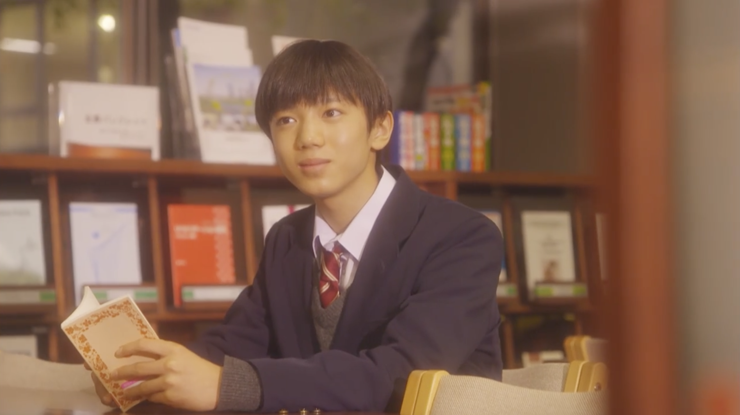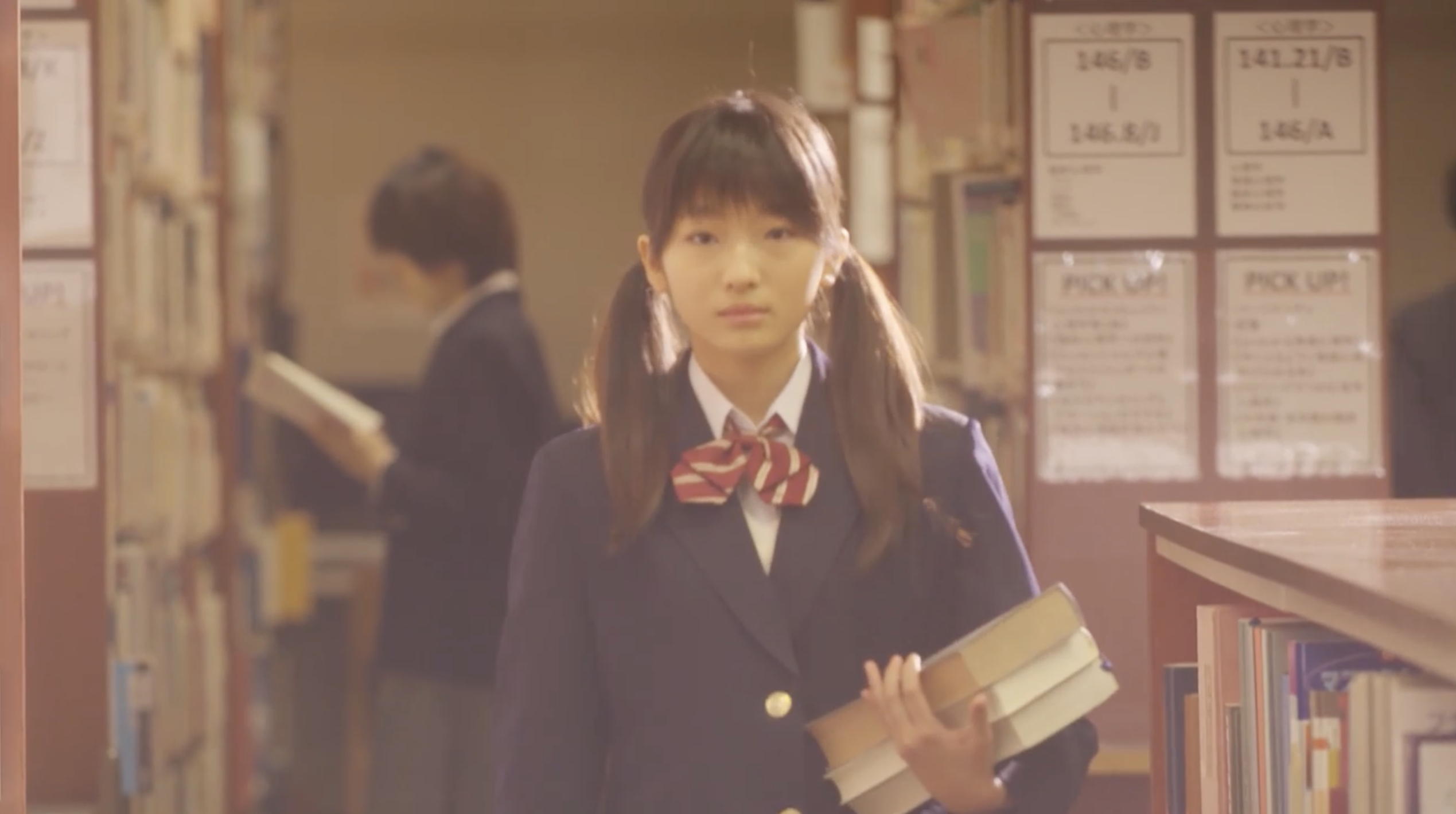 〔回想:中学校の図書室手本を運ぶゆかり、風見青年がゆかりを見つめている〕