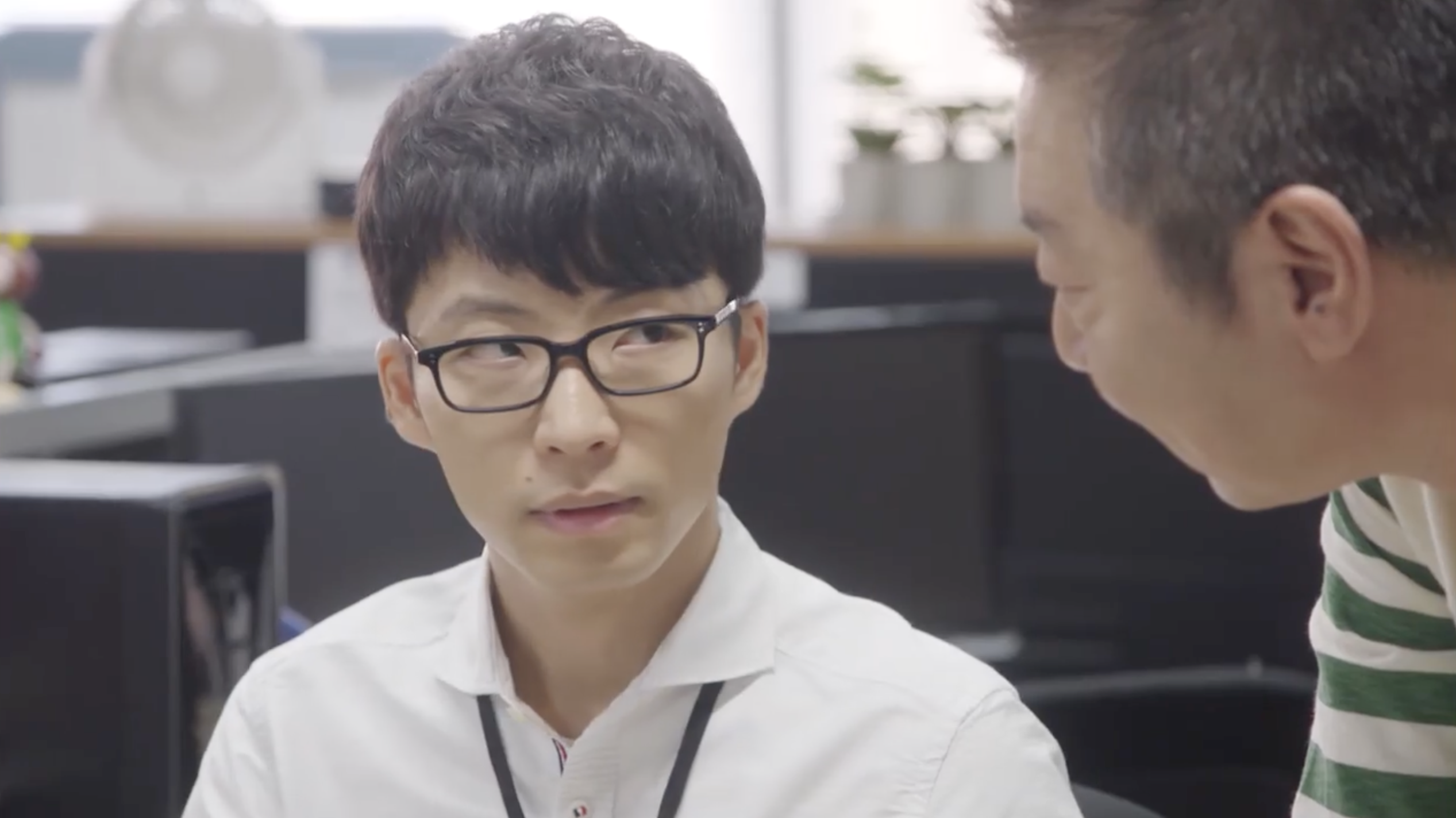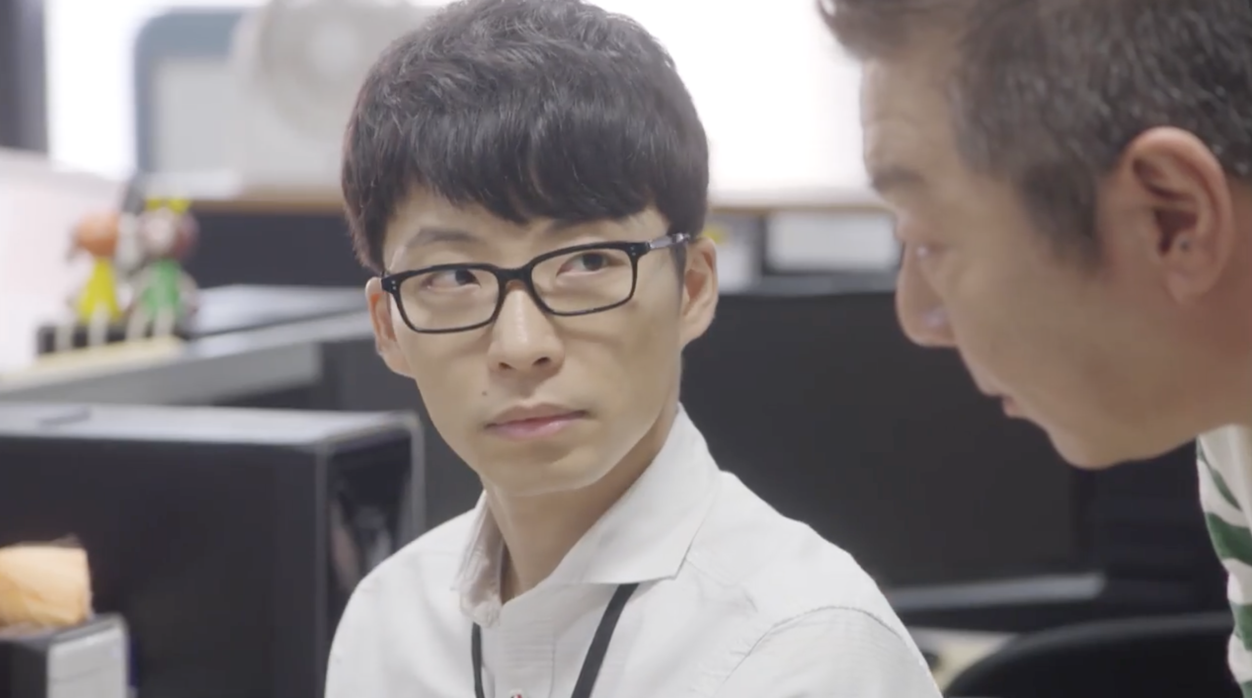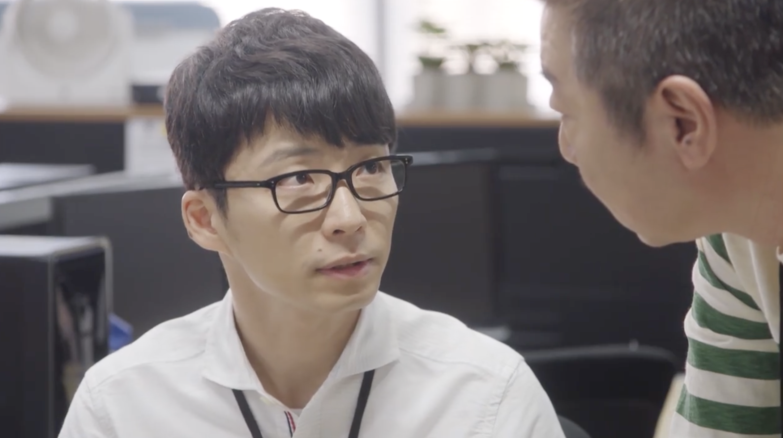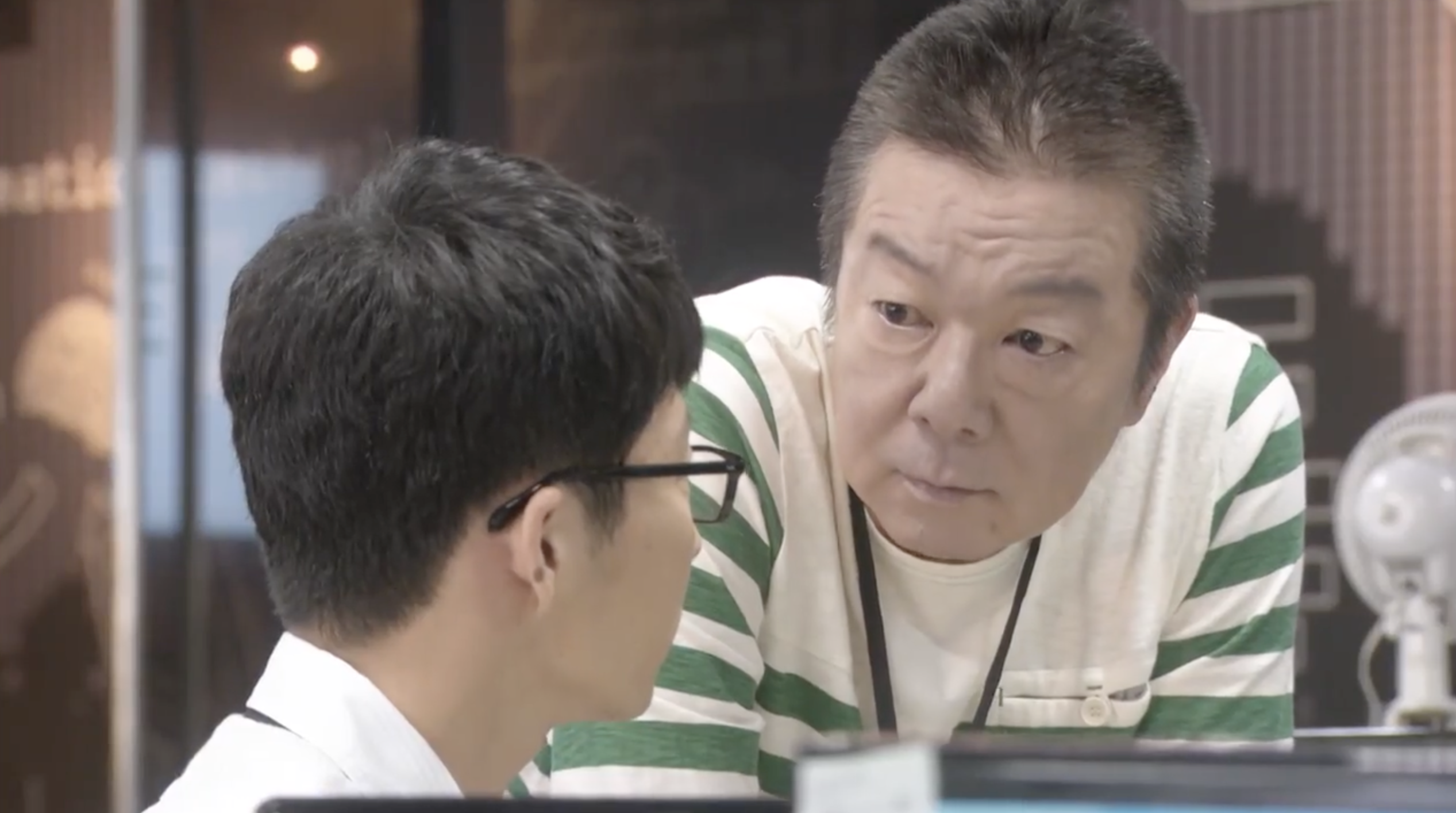 COMMENT:このシーンは、第1話の前半、スリーアイシステムのオフィスで、平匡の手がふっと止まる時間が何度も映ります。プログラム画面は開いたまま、作業が進んでいるようでいて進んでいない。周囲はいつも通りの職場のざわめきなのに、本人の中だけ別の処理が走っている感じがするんですよね。そこへ沼田が、いかにも沼田らしく距離を詰めてくる。「これ、いらないんじゃない?」とプログラム・コードの話から入りつつ、いつの間にか平匡の異変監視へと話題が移っていく。からかっているようで、実はちゃんと観察している。職業病だと言いつつ、心配を正当化している。でも、そうした沼田なりのコミュニケーション・スタイルも、平匡にとっては助け舟になっているのかもしれません。