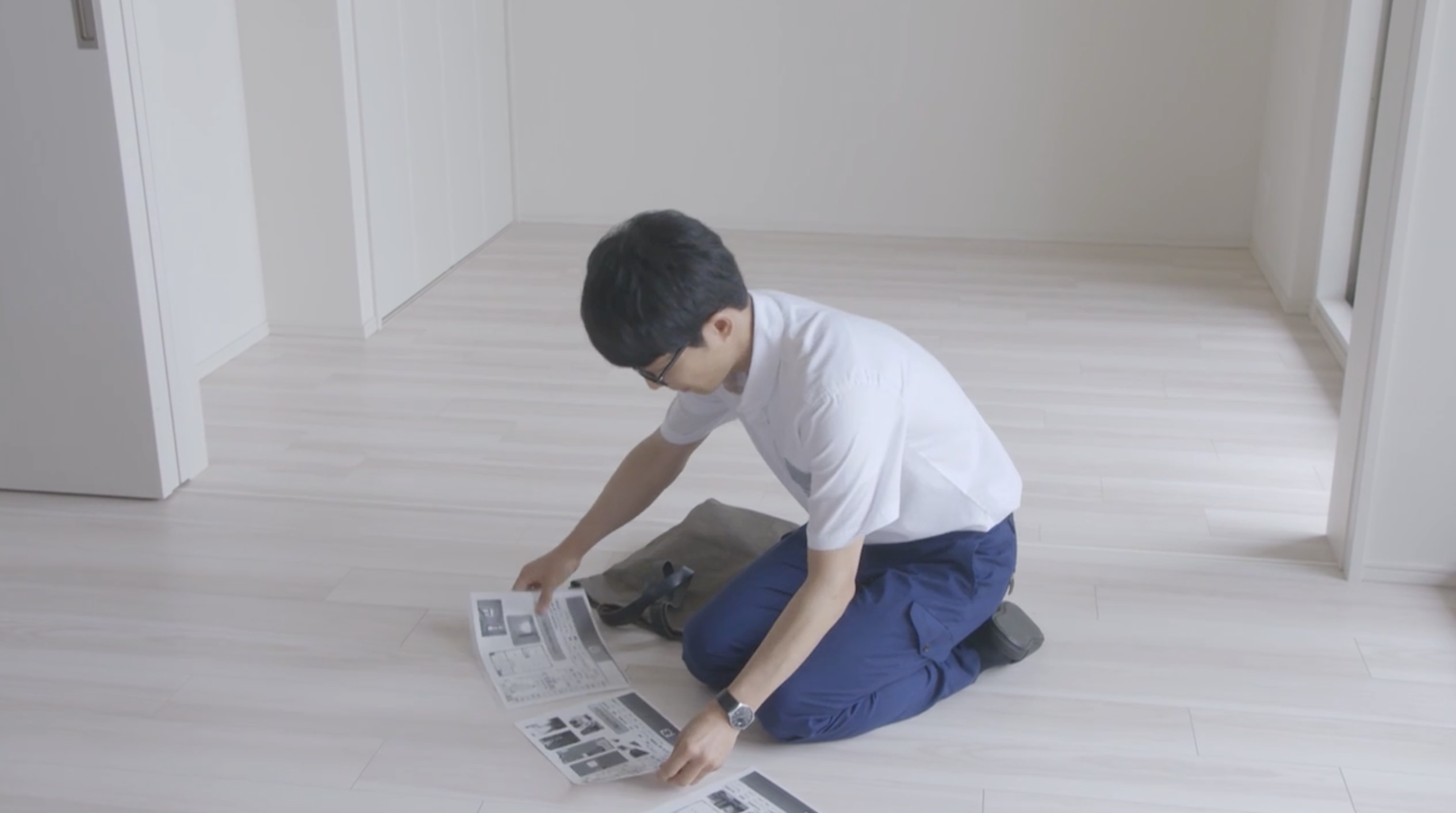 〔平匡、座って物件のコピーを床に並べる〕